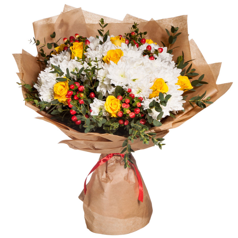 Этот букет передаёт яркие эмоции с белыми хризантемами и жёлтыми кустовыми розами, дополненными гиперикумом и зеленью. Упакован в крафт-бумагу с красной атласной лентой, что придаёт ему элегантности. Композиция создаёт атмосферу праздника и радости. Подарок идеально подойдёт для встречи из поездки для любимого.