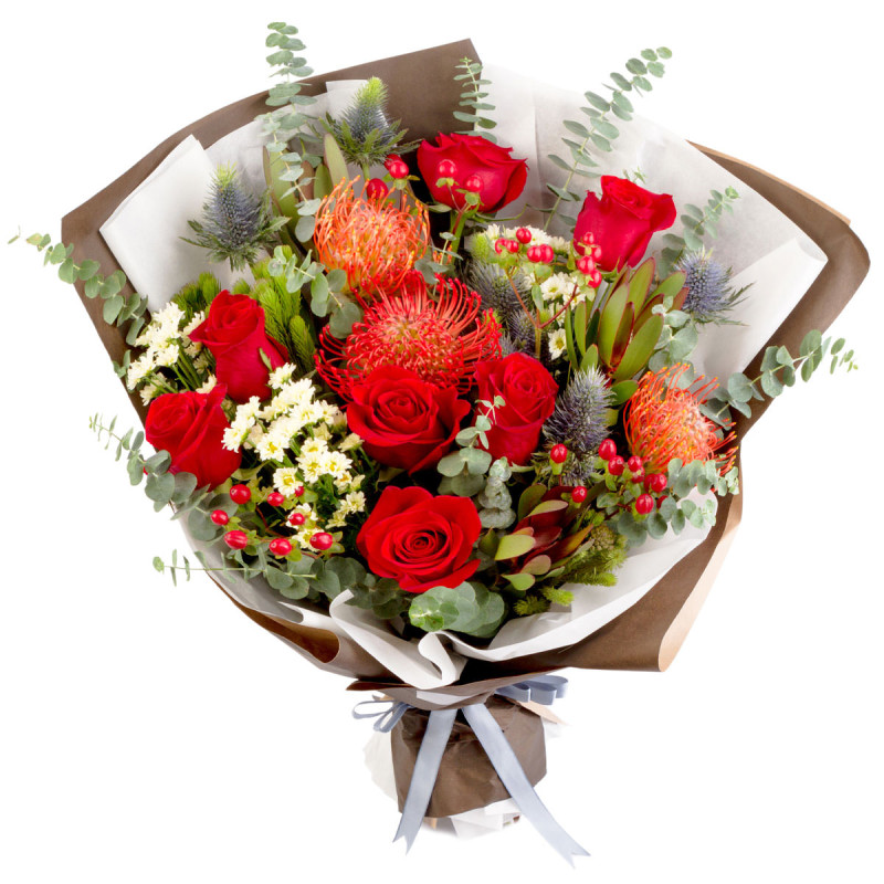 Яркие красные розы и леукосперум в сочетании с гиперикумом, эрингиумом, мини-хризантемами и эвкалиптом создают энергичное настроение. Букет оформлен в стильную крафт-бумагу и перевязан серой атласной лентой. Композиция создаёт атмосферу торжественности и элегантности. Прекрасный подарок для молодой мамы на долгожданную встречу.