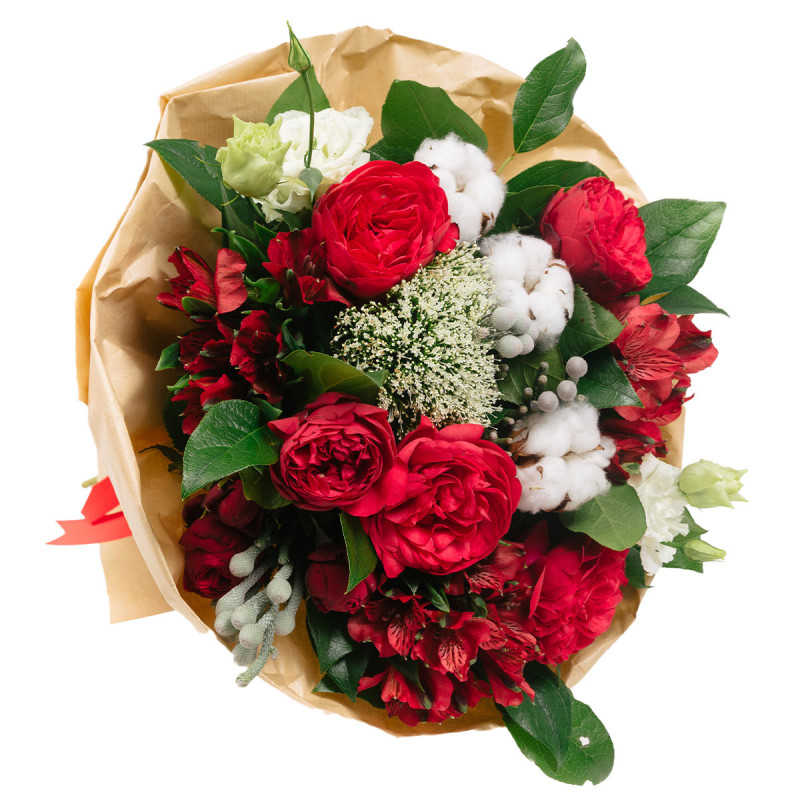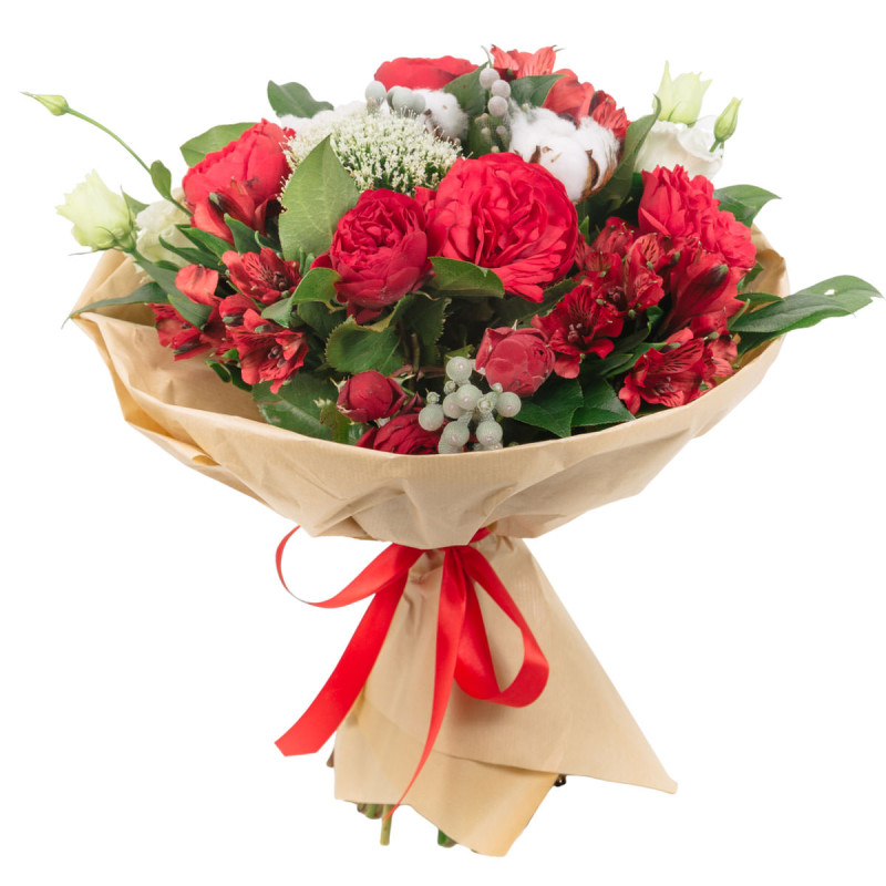 Яркая красная палитра букета создаёт ощущение тепла и страсти. В составе роза одноголовая пионовидная красная, альстромерия красная, эустома белая, бруния и хлопок. Букет оформлен в крафт-бумагу и украшен красной лентой, придающей ему элегантность. Эта композиция создаёт атмосферу праздника и станет идеальным подарком для любимой женщины на годовщину.