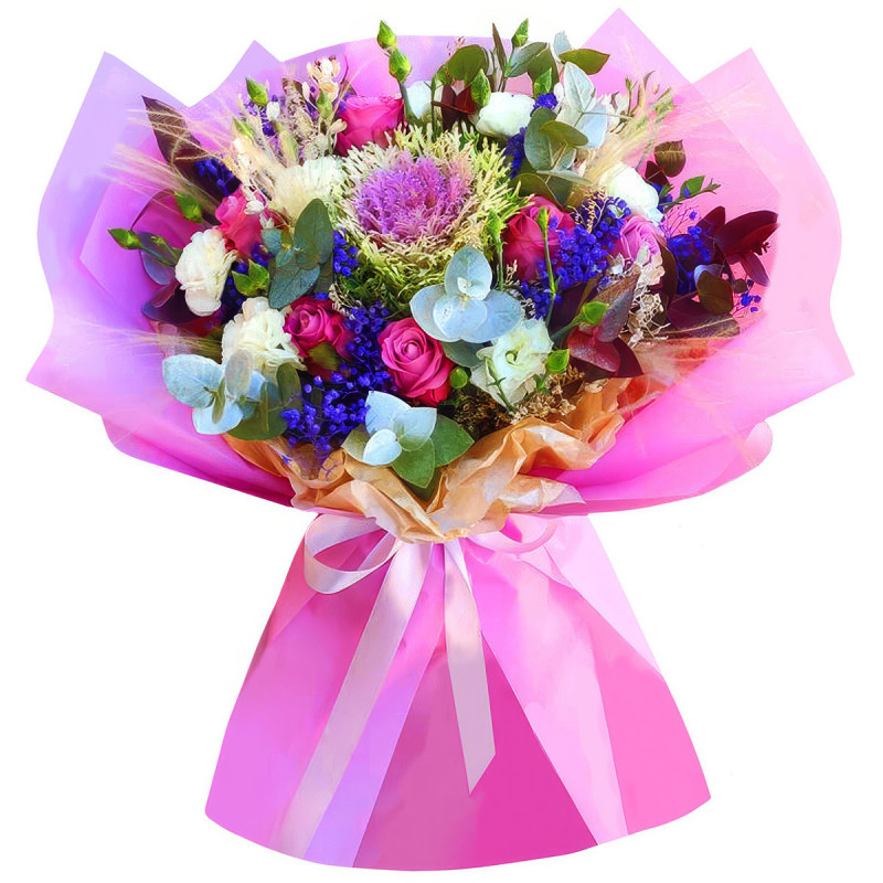 Этот букет излучает нежность благодаря розовым и белым оттенкам. В составе брассика, кустовая розовая роза, белая эустома, синяя гипсофила и эвкалипт, которые создают гармоничную композицию. Оформлен в розовую матовую плёнку и украшен атласной лентой. Подарок, который создаст атмосферу радости и тепла. Подойдет для встречи выпускников и отлично порадует учителя.