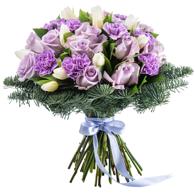 Этот букет наполнен нежностью сиреневых роз и гвоздик, которые идеально гармонируют с белоснежными тюльпанами и насыщенной зеленью пихты. Композиция украшена элегантной голубой лентой, придающей ей особую утонченность. Такой букет создаёт атмосферу романтики и изысканности. Идеально подойдёт на годовщину для любимой женщины.