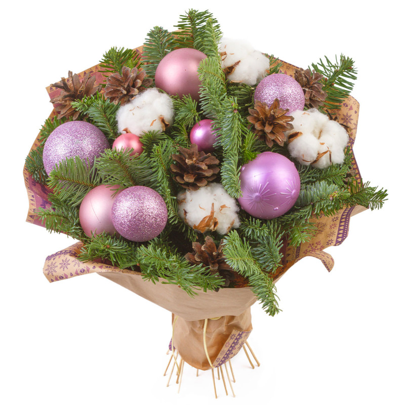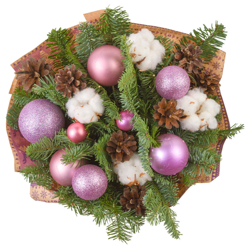 Праздничное сочетание насыщенной зелени пихты и нежного белого хлопка создает атмосферу зимней сказки. В композиции также присутствуют шишки и новогодние шары, придающие ей особый шарм. Букет оформлен в крафт-бумагу и матовую пленку, украшен лентой. Идеальный подарок на новогодний корпоратив для коллег.