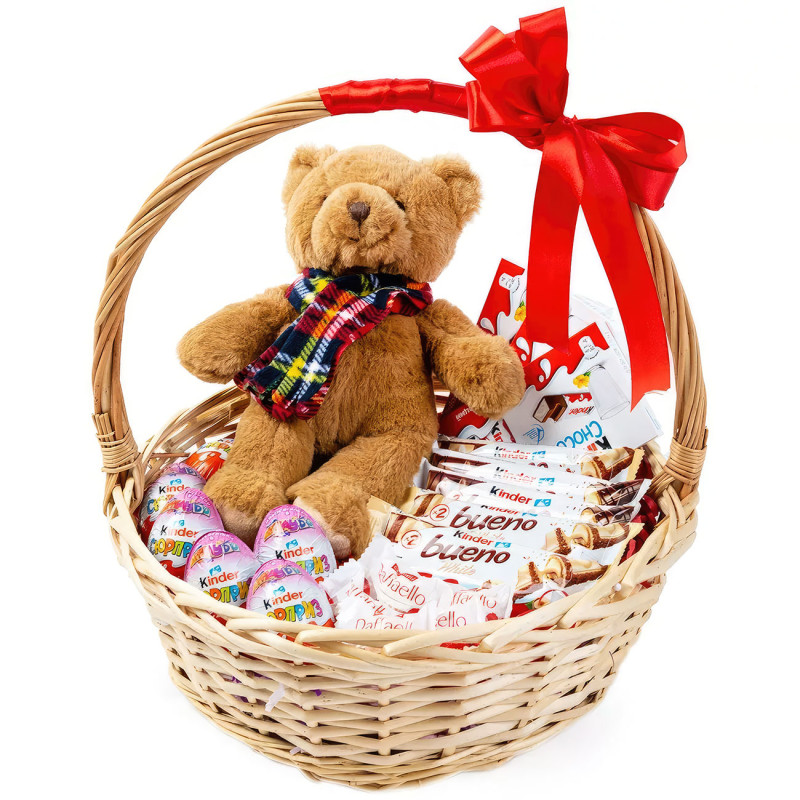 Яркая и радостная композиция в плетёной корзине с красной лентой. В составе мягкая игрушка, киндер сюрприз, конфеты рафаэлло и киндер шоколад. Плетёная корзина с ручкой украшена ярким бантом, создавая атмосферу уюта и тепла. Идеально подойдёт для поздравления ребёнка на день рождения.