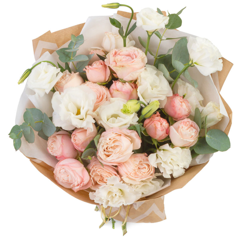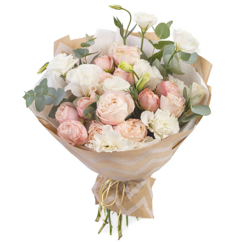 Этот букет дарит ощущение нежности благодаря сочетанию розовых пионовидных роз и белоснежной эустомы, дополненных свежестью эвкалипта. Упакован в крафт-бумагу с зигзагообразным узором, что придаёт ему стильный вид. Композиция создает атмосферу утончённой романтики и радости. Идеально подойдёт для поздравления любимой на годовщину.