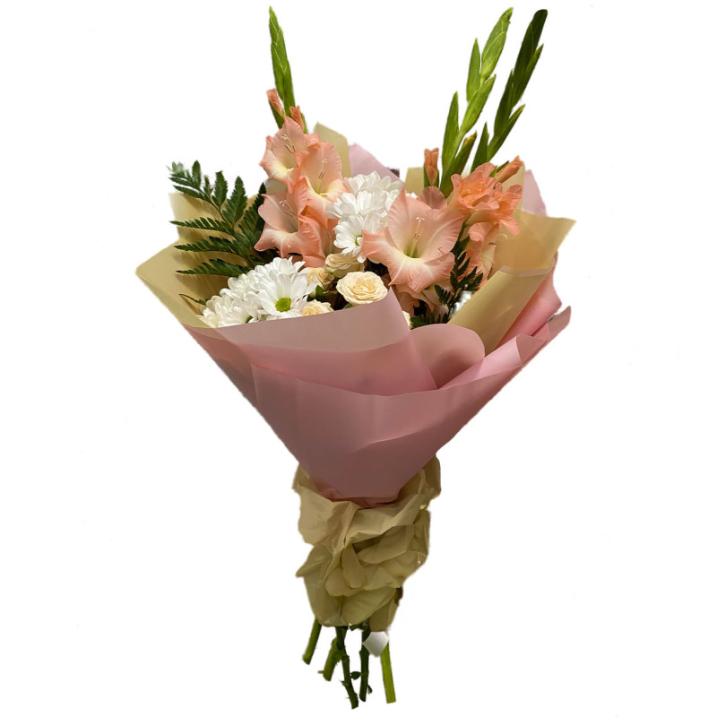 Этот букет источает нежность и тепло благодаря персиковым гладиолусам, белым кустовым хризантемам и кремовым кустовым розам, обрамленным зеленью. Упакован в нежно-розовую и жёлтую матовую пленку, что придаёт композиции легкость и воздушность. Букет создаёт атмосферу уюта и радости, идеально подходя для встречи выпускников. Порадует учительницу своим утонченным дизайном и светлыми оттенками.