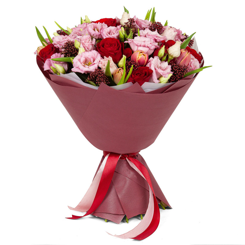 Эта композиция начинается с яркого и насыщенного красного цвета роз, дополняется нежными розовыми тюльпанами и эустомами, а также озотамнусом. Букет оформлен в матовую плёнку, украшен сеткой и завязан лентой. Композиция создаёт атмосферу торжественности и радости. Прекрасно подойдет для вручения на День Святого Валентина и порадует любимую женщину.