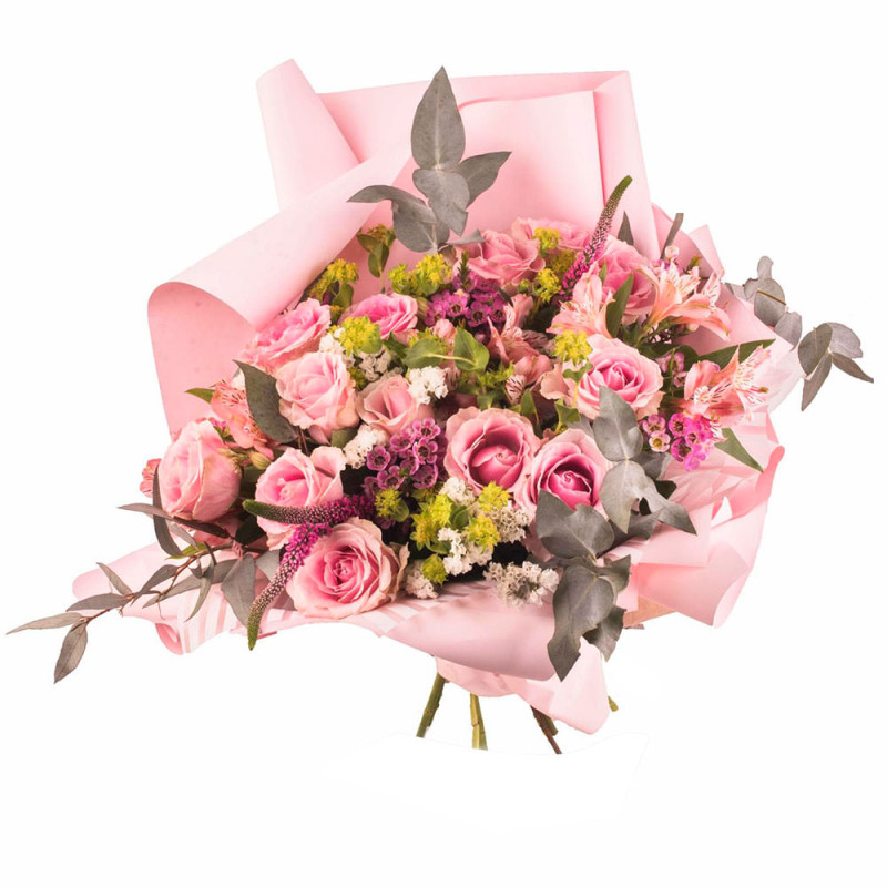 Нежная розовая гамма букета создаёт атмосферу утончённости и романтики. В состав входят розовые розы, лимоникум, ваксфлауэр, вероника и эвкалипт. Букет аккуратно оформлен в матовую розовую плёнку, подчёркивающую его изящество. Он отлично подойдёт для романтического вечера на День влюблённых и станет прекрасным подарком для любимой женщины.