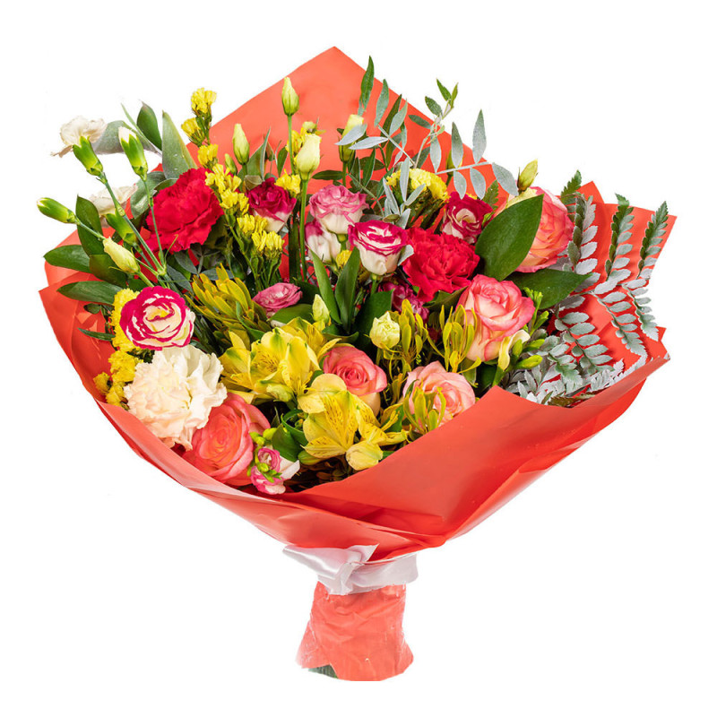 Яркое сочетание розовых, красных и жёлтых оттенков дарит ощущение весеннего вдохновения. В этом букете присутствуют розовые одноголовые розы, бело-розовая эустома, красная гвоздика, жёлтая альстромерия и зелень. Упакован в матовую оранжевую плёнку с декоративной лентой. Создаёт атмосферу радости и будет идеальным подарком на День учителя для любимой учительницы.