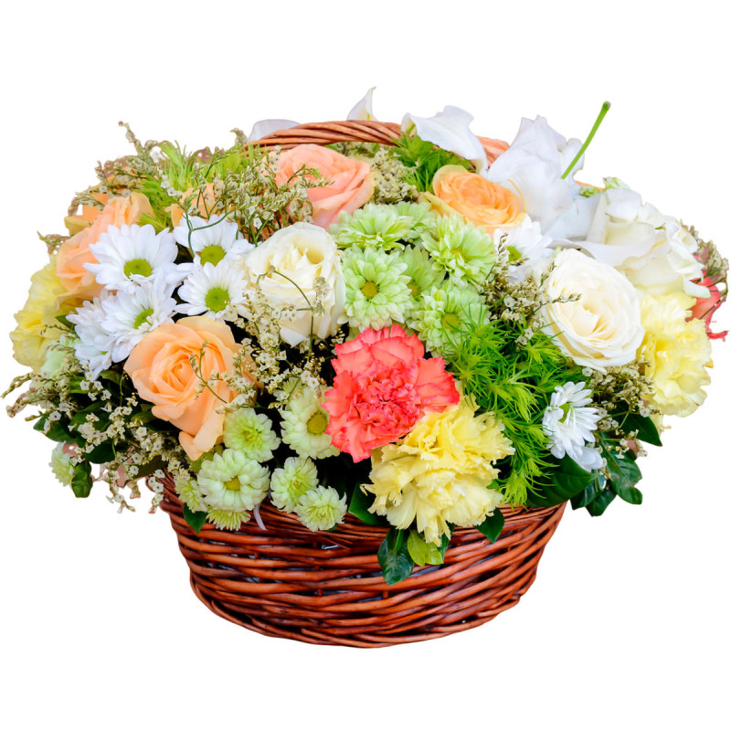 Яркая композиция, наполненная теплом и светом, сочетает в себе персиковые и белые розы, белые и желтые кустовые хризантемы, а также розовые и желтые гвоздики с зеленью. Все цветы аккуратно расположены в плетёной корзине, добавляющей природной эстетики. Этот букет создаст атмосферу уюта и радости, идеален для поздравления преподавателя на День учителя.
