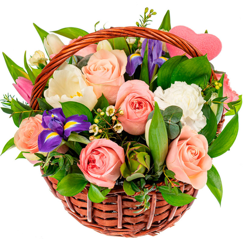 Эта композиция в нежных розовых и белых тонах создаст атмосферу легкости и романтики. В состав входят розы, ирисы, белые тюльпаны, белые гвоздики, ваксфлауэр, фисташка и зелень. Цветы расположены в плетёной корзине, что делает композицию стильной и элегантной. Идеальный подарок для любимой на годовщину или для подруги на День матери.