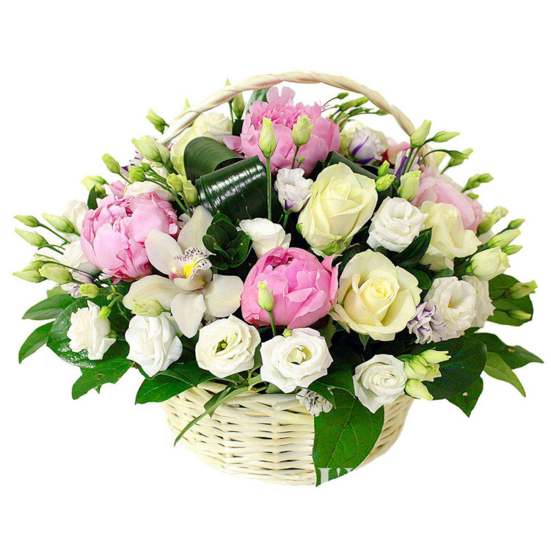 Эта нежная композиция в пастельных тонах дарит атмосферу весенней свежести. В составе пион розовый, роза кремовая, эустома белая и орхидея кремовая, дополненные зеленью аспидистры. Корзина выполнена из светлого плетения, добавляя легкость и элегантность. Идеально подойдет для поздравления мамы на День матери.