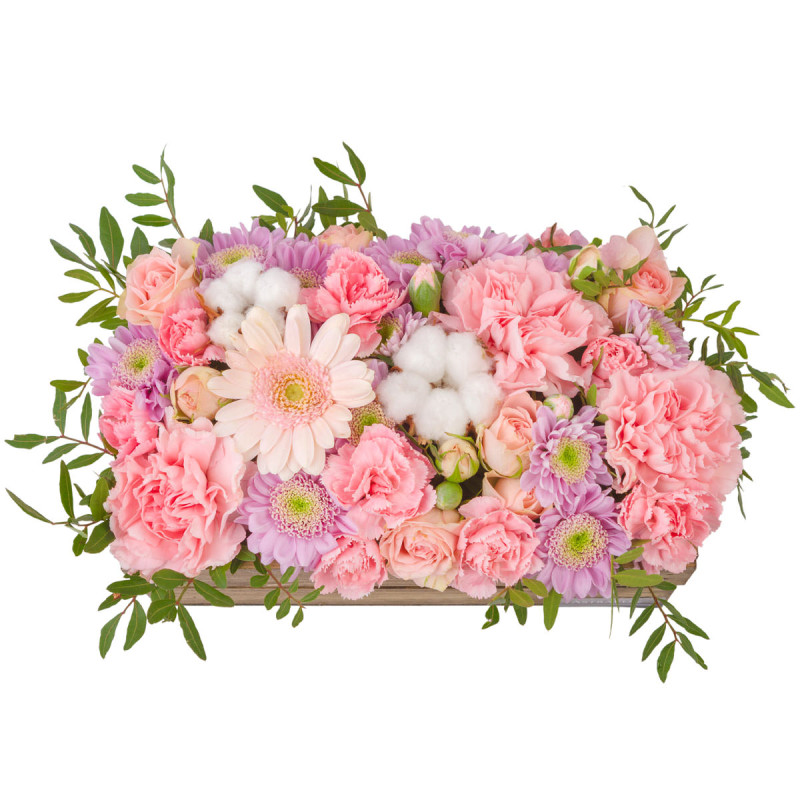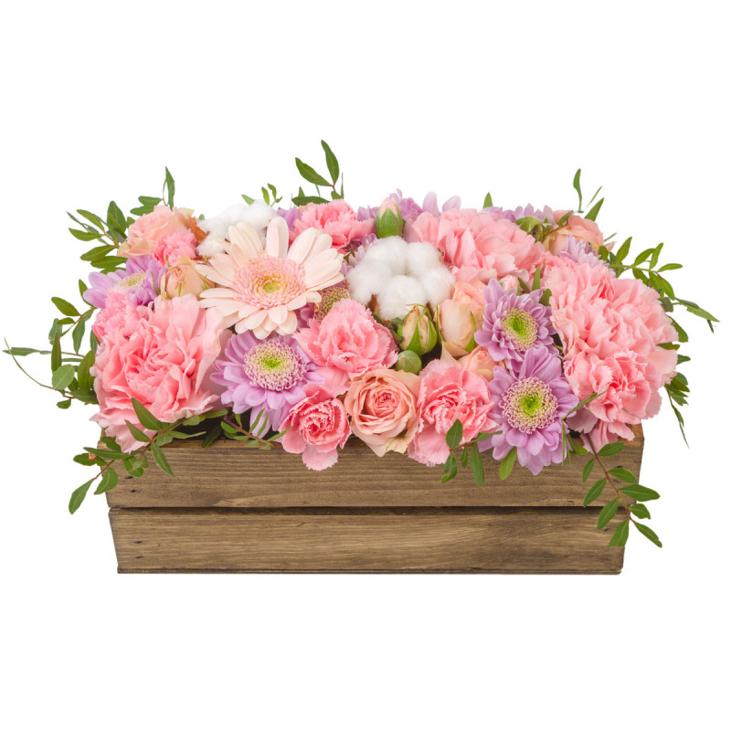 Нежная цветовая гамма сиреневых и розовых оттенков создаёт атмосферу уюта и романтики. Композиция включает сиреневые и розовые герберы, розовые гвоздики, розовые кустовые розы и хлопок, дополненные фисташкой. Цветы аккуратно уложены в деревянный ящик, который подчёркивает их природную красоту. Идеально подойдёт для подарка на встречу выпускников для любимой женщины.