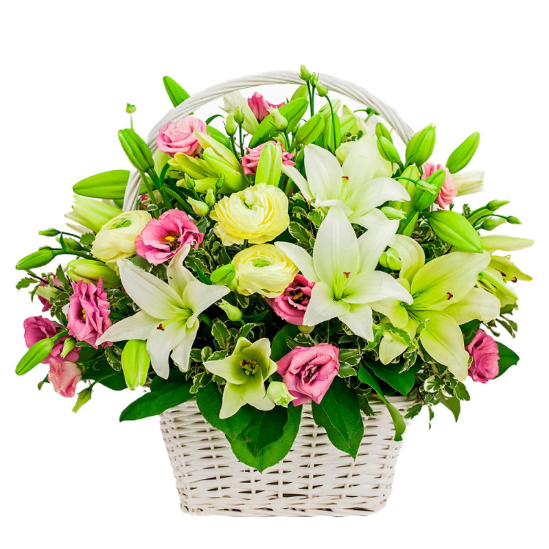 Эта нежная композиция из белых лилий, ранункулюсов и розовой эустомы в сочетании с зеленью создаёт атмосферу лёгкости и изящества. Цветы аккуратно расположены в белой плетёной корзине, что придаёт композиции особую элегантность. Подходит для поздравления партнёров на профессиональный праздник. Прекрасный подарок для любой женщины.