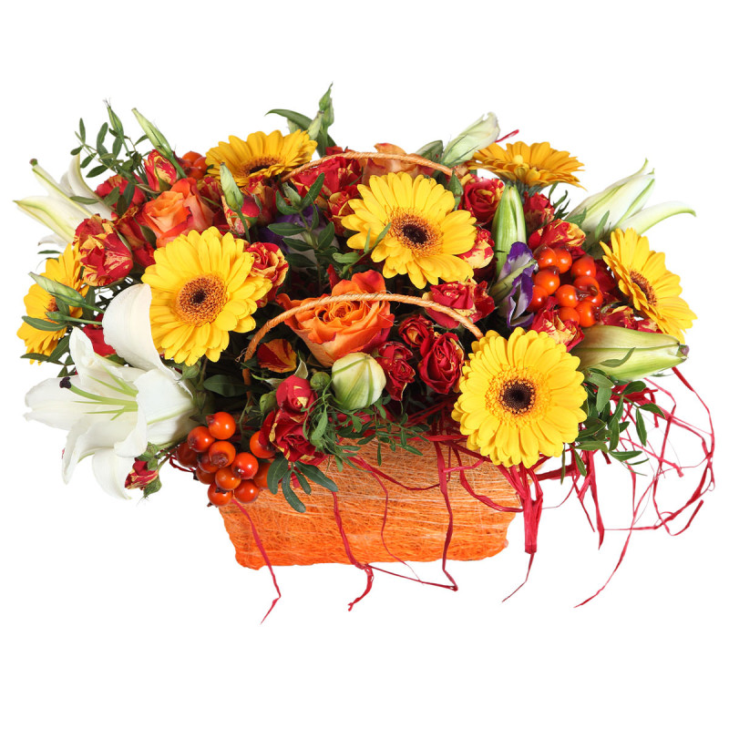 Эта композиция излучает тепло и яркость благодаря жёлтым герберам и оранжевым розам, дополненным белыми лилиями и фиолетовой эустомой. В состав также входит гиперикум, что придаёт композиции особую текстуру. Цветы размещены в плетёной корзине с оранжевым оазисом, создавая уникальное визуальное впечатление. Эта корзина станет замечательным подарком на юбилей для любимой женщины, наполняя её день радостью и светом.