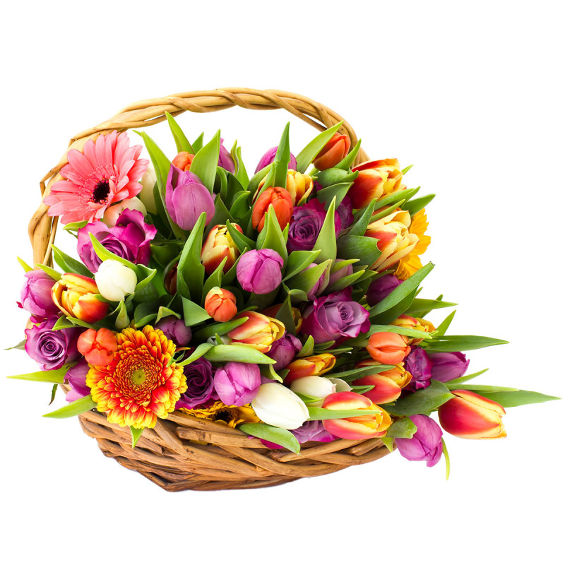 Эта композиция излучает радость своими яркими жёлтыми, розовыми и оранжевыми герберами, сиреневыми розами и разноцветными тюльпанами. Плетёная корзина придаёт естественность и уют. Создаёт атмосферу веселья и тепла. Идеально подойдёт для подарка на День знаний для преподавателя.