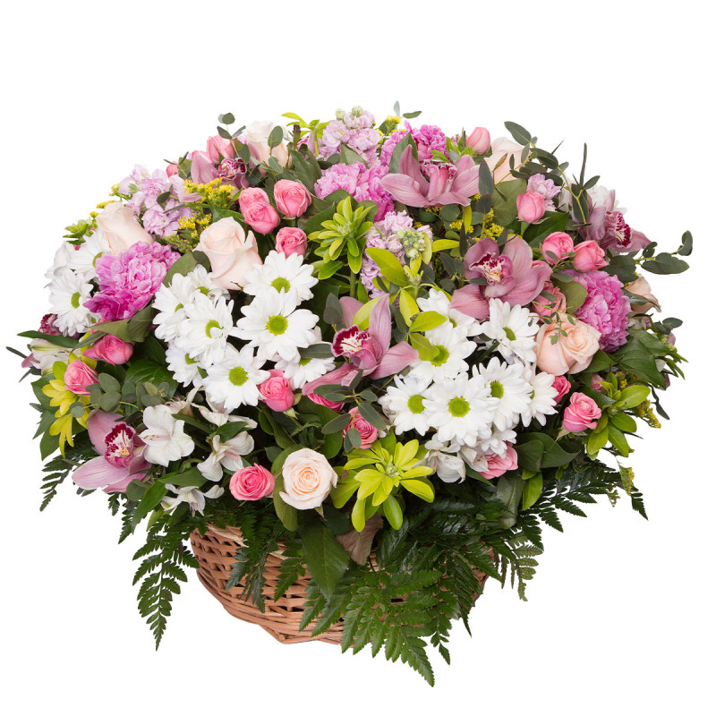 Эта композиция дарит нежность и гармонию, сочетая розовые и белые оттенки. В букете присутствуют розовые и белые кустовые розы, розовые орхидеи, белые альстромерии, розовые пионы, белые кустовые хризантемы и солидаго. Цветы аккуратно размещены в плетёной корзине. Композиция создаёт атмосферу романтики, идеально подходящую для свидания. Порадует любимую женщину на 8 Марта.
