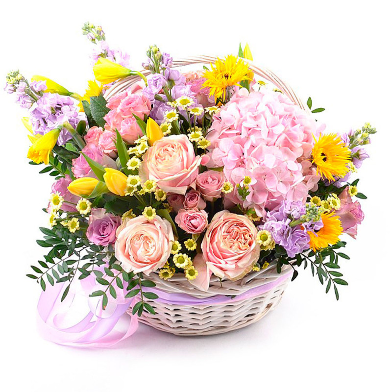 Эта цветочная композиция дарит ощущение яркой весенней радости благодаря сочетанию желтых гербер и тюльпанов, розовых и кустовых роз, а также сиреневой маттиолы. Корзина украшена розовой гортензией и дополнена нарциссами, танацетумом и ромашками, создавая атмосферу свежести и нежности. Плетёная корзина с лентой добавляет изысканности и шарма. Идеально подойдет для поздравления молодой мамы на День семьи, любви и верности.