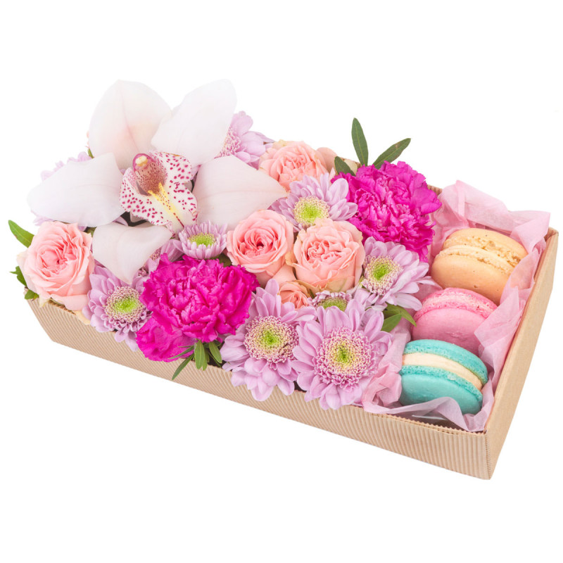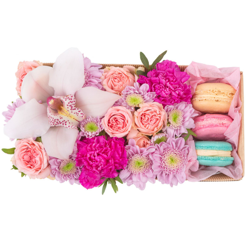 Эта яркая композиция в нежных пастельных тонах включает в себя белую орхидею, розовые одноголовые розы, сиреневые кустовые хризантемы и розовые пионы. Все цветы аккуратно расположены в коробке, добавляют изысканности макароны, которые сопровождают цветы. Такое оформление создаёт атмосферу уюта и изысканности. Подходит для подарка на долгожданную встречу для любимой женщины.