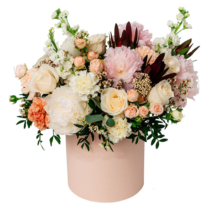 Великолепное сочетание кремовых и розовых оттенков создаёт атмосферу нежности и романтики. В составе букета — кремовая одноголовая роза, белая маттиола, хамелациум, кремовая кустовая роза, розовый пион, кремовая гвоздика, леукодендрон, фисташка и эвкалипт. Композиция представлена в элегантной шляпной коробке нежного розового цвета. Этот букет станет отличным подарком для жены на день рождения, создавая атмосферу праздника и радости.