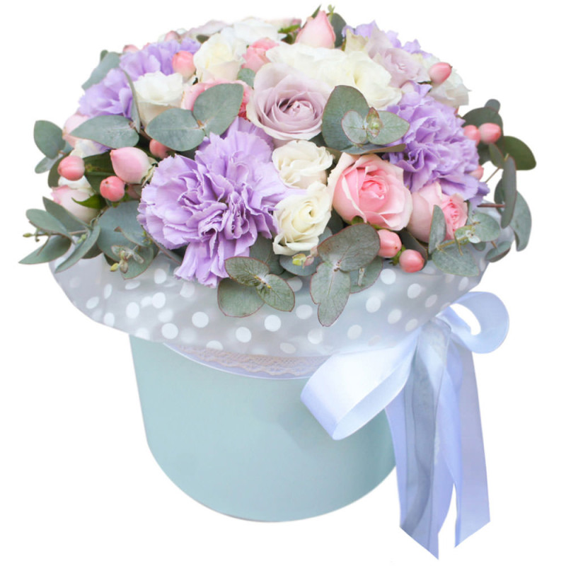 Нежное сочетание сиреневых гвоздик и разноцветных кустовых роз сразу привлекает внимание. В букете также присутствуют гиперикум и эвкалипт, добавляя элегантности композиции. Цветы оформлены в светло-голубую шляпную коробку с белым атласным бантом, придавая изысканности. Этот букет создаст романтическую атмосферу и станет идеальным подарком для крестника на платиновую свадьбу.