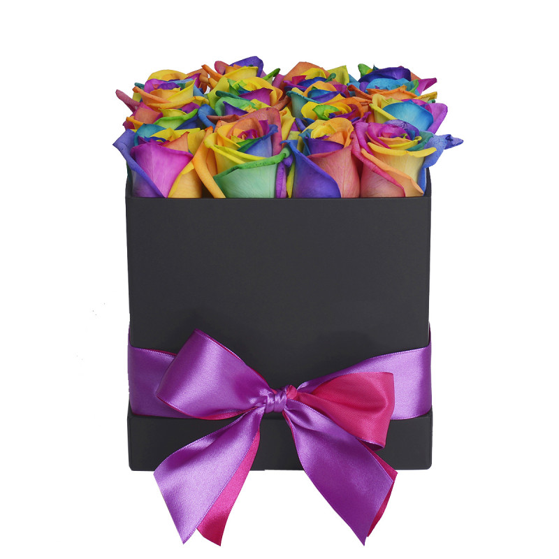 Яркие радужные розы создают атмосферу радости и веселья. В составе: роза одноголовая радужная. Упакованы в стильную черную квадратную коробку, декорированную яркой фиолетовой лентой. Этот букет станет отличным подарком для возлюбленного на День влюблённых, создавая праздничное настроение.