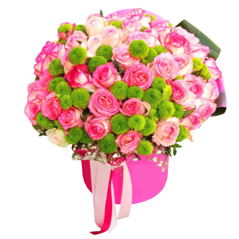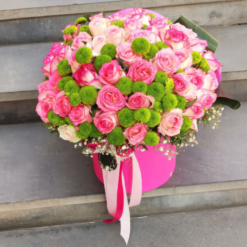 Этот нежный букет сочетает в себе розовую розу и зеленую хризантему, создавая атмосферу романтики и свежести. Композиция аккуратно уложена в шляпную коробку, которая придаёт букету изысканность и завершённость. Подходит для создания праздничного настроения на выпускной бал. Идеально подойдёт для подарка для молодой мамы.