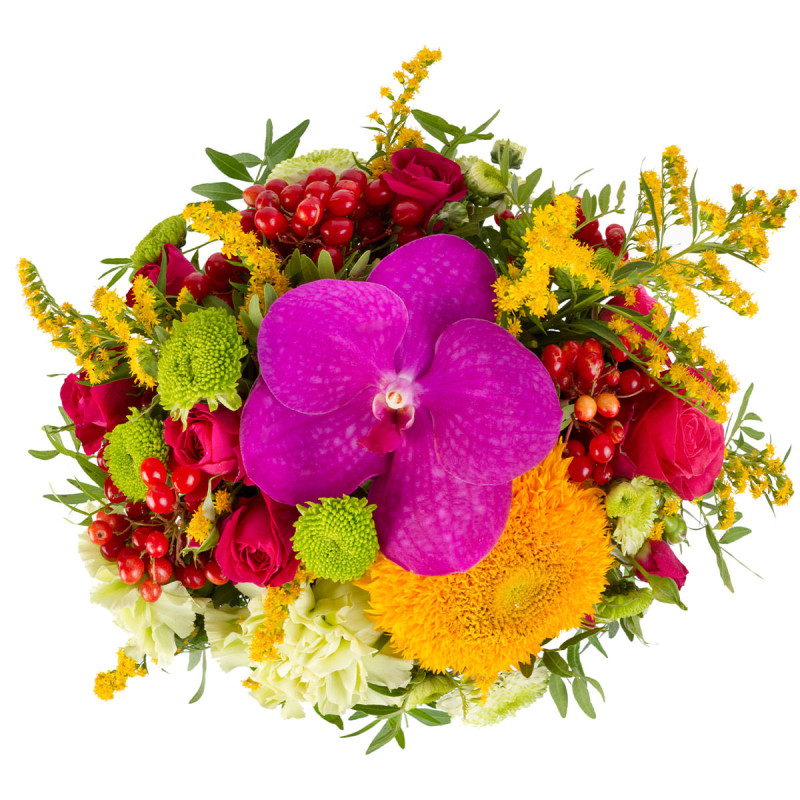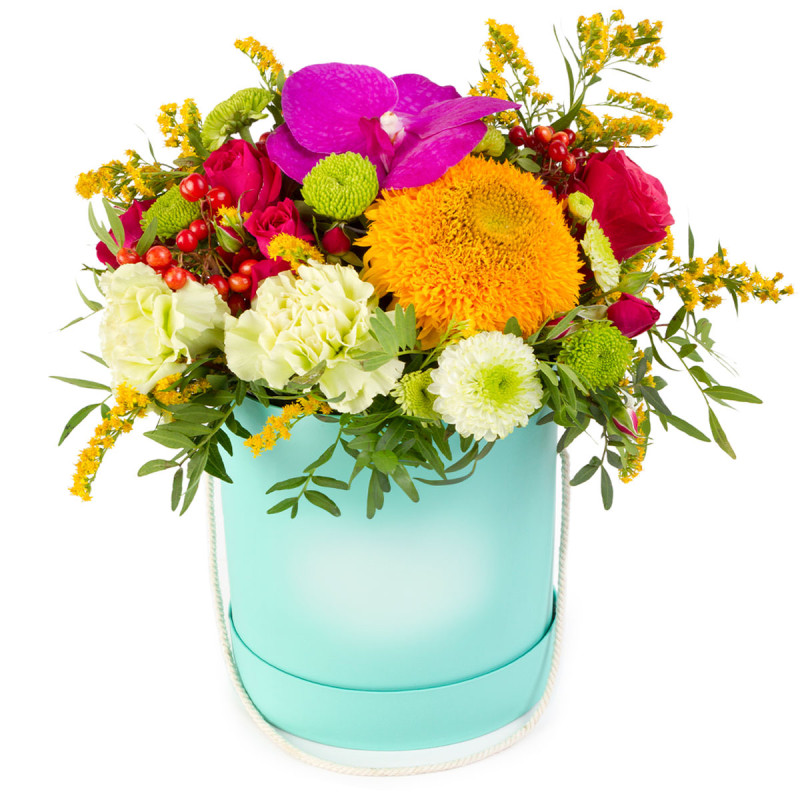 Яркие и насыщенные краски этой композиции подарят вам заряд позитива. Орхидея Ванда, кремовая гвоздика, розовая кустовая роза, подсолнечник тедди беар, зеленая и белая хризантемы, гиперикум, солидаго и фисташка создают гармоничное сочетание. Букет представлен в стильной цилиндрической коробке нежно-голубого цвета. Эта композиция создаст атмосферу радости и уюта, подойдет для вручения на юбилей для любимой женщины.