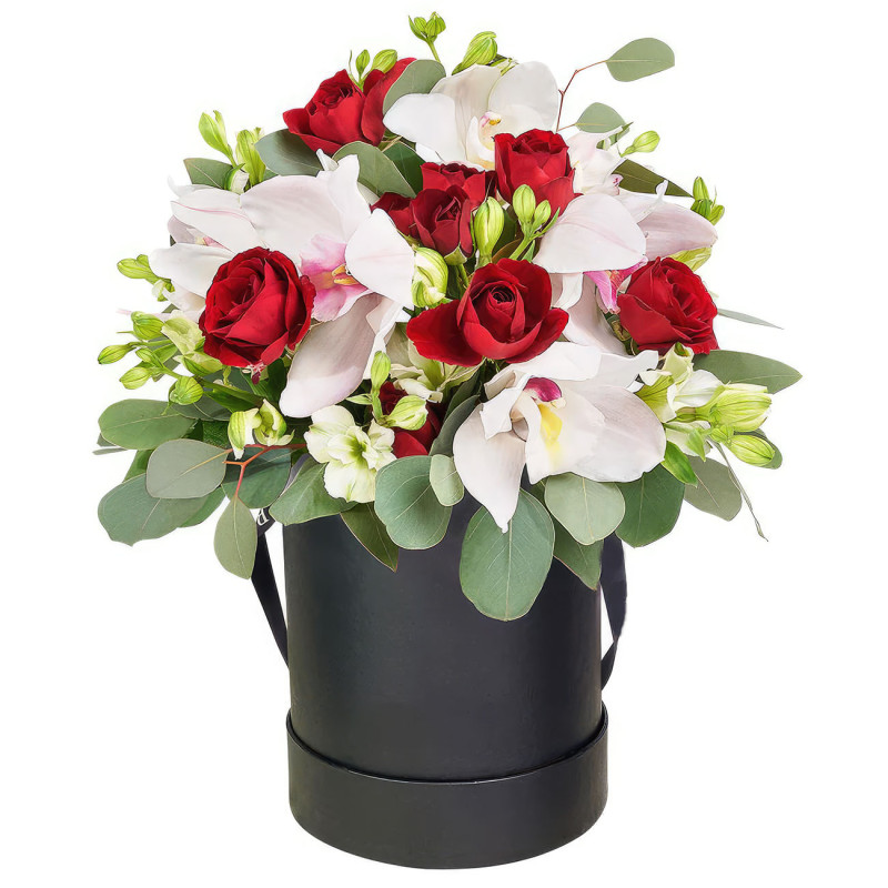 Яркий контраст красных роз и белых орхидей с альстромериями создает атмосферу романтики и нежности. Композиция включает розу одноголовую красную, орхидею белую, альстромерию белую и эвкалипт. Цветы размещены в стильной шляпной коробке, добавляя изысканности и утонченности. Отличный подарок для любимой женщины на годовщину, чтобы выразить свою любовь и заботу.