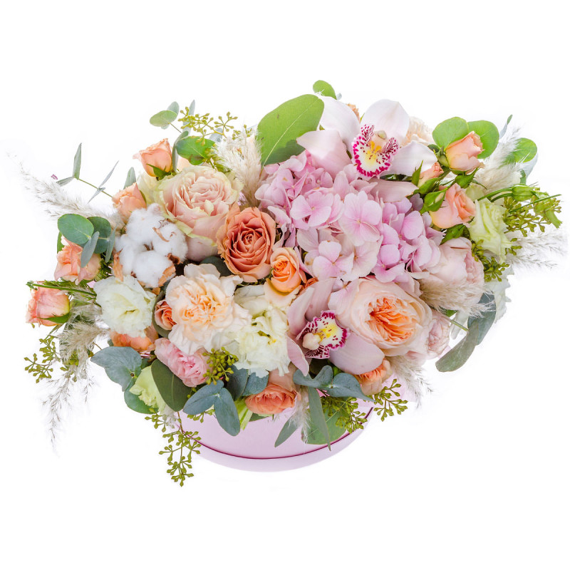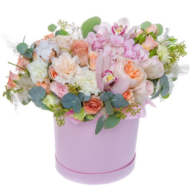 Эта композиция поражает своей нежной палитрой розовых и кремовых оттенков. В составе букета пионовидные персиковые розы, розовые орхидеи, кремовые гвоздики, белые эустомы, розовая гортензия, сухоцвет и эвкалипт. Все цветы аккуратно расположены в розовой шляпной коробке, создавая элегантный и стильный вид. Такой букет создаёт атмосферу нежности и будет идеальным подарком для начальницы на День матери.