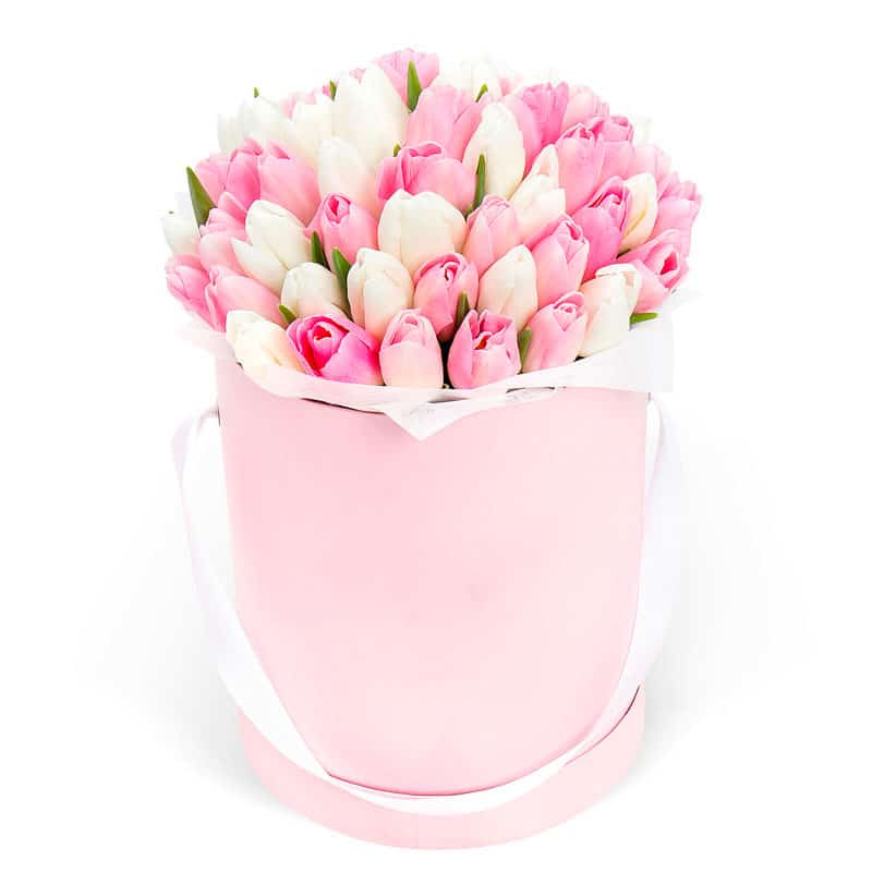 Композиция из белых и розовых тюльпанов создаёт нежное настроение. Цветы аккуратно уложены в розовую шляпную коробку, дополненную белой лентой. Этот букет привнесет атмосферу радости и легкости. Идеально подходит для поздравления сестры на День Святого Валентина.