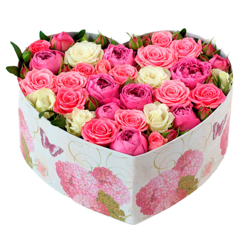 Элегантная композиция в нежных розовых и белых тонах вызывает чувство умиротворения и радости. В состав входят пионовидные розовые розы, а также розовые и белые кустовые розы. Цветы расположены в изысканной коробке в форме сердца, украшенной романтичными принтами с бабочками и цветами. Эта композиция создаст атмосферу любви и нежности, идеально подходя для подарка на годовщину для любимой женщины.