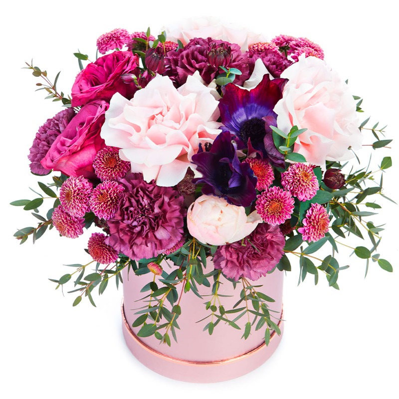 Эта цветочная композиция создает атмосферу нежности благодаря розовым и сиреневым оттенкам. В составе роза одноголовая розовая, гвоздика сиреневая, анемон бордо, хризантема кустовая розовая и эвкалипт. Цветы собраны в стильную круглую шляпную коробку, подчеркивая их утонченную красоту. Идеально подойдет для романтического вечера, чтобы порадовать любимую женщину.