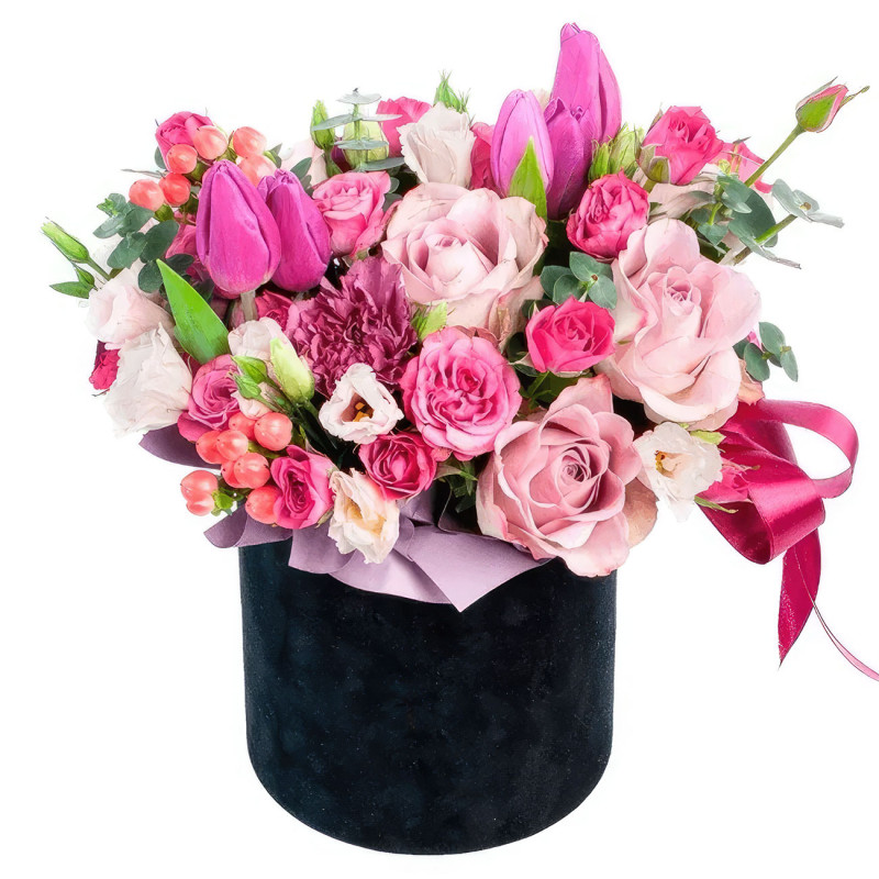 Яркие розовые и фиолетовые оттенки создают романтичное настроение. В составе — роза одноголовая, тюльпан, кустовая роза, эустома и гиперикум. Упаковка представлена в виде стильной шляпной коробки тёмного цвета, с украшением в виде атласной ленты. Эта композиция создаёт атмосферу нежности и заботы. Идеально подойдёт для романтического вечера для любимой.