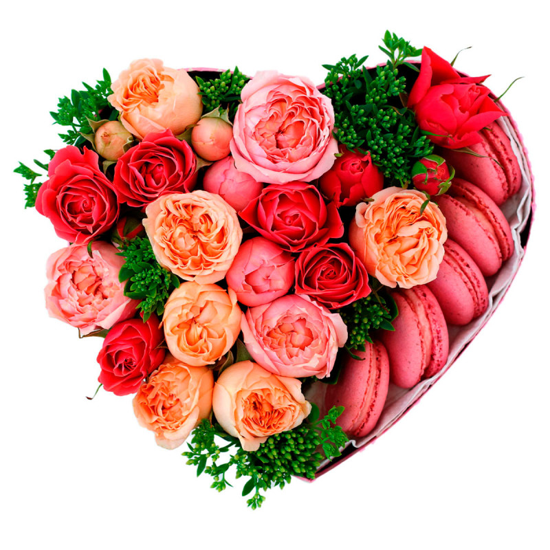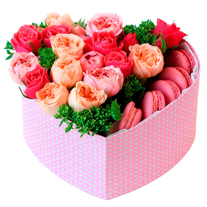 Эта композиция в розовых тонах дарит ощущение нежности и радости. В составе пионовидные персиковые и розовые розы, а также одноголовые розовые розы, зелень и макароны. Коробка в форме сердца выполнена в розовом цвете с узором. Она создаёт атмосферу романтики и изысканности. Подойдёт для поздравления на День влюблённых и порадует любимую.