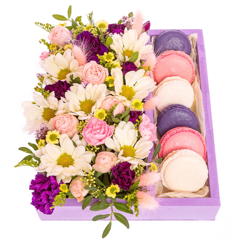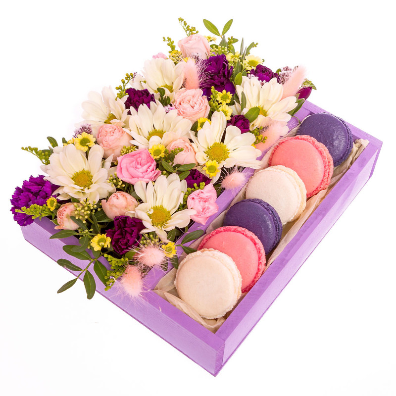 Эта композиция поражает гармонией белых ромашек, фиолетовых гвоздик и жёлтой кустовой хризантемы, создавая атмосферу радости и свежести. Цветы дополнены лагурусом и солидаго, а также изысканными макаронами. Упаковано в элегантную коробку с оазисом. Подойдёт для романтического вечера для любимой женщины.