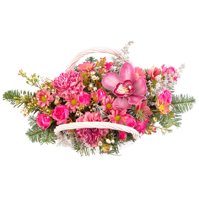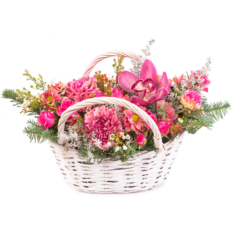 Яркость и нежность розовой гаммы создают атмосферу радости и тепла. В составе розовая орхидея, розовая гвоздика, розовая кустовая роза, розовая хризантема, ваксфлауэр и пихта. Композиция оформлена в белой плетёной корзине с двумя ручками. Идеально подойдёт для встречи из роддома, чтобы порадовать молодую маму.