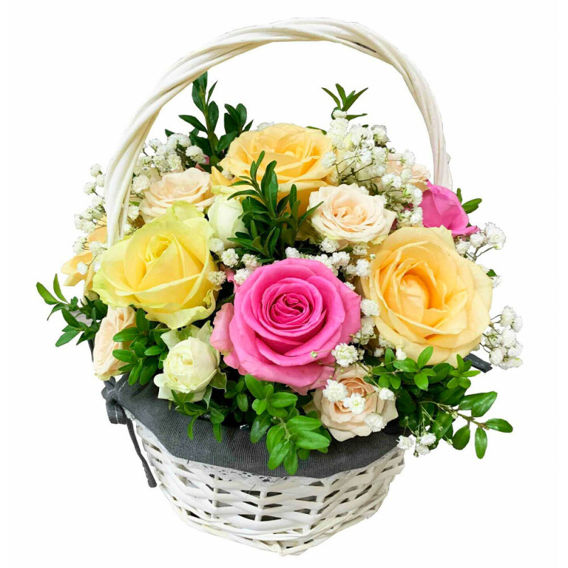 Эта композиция наполнена нежными розовыми и желтыми оттенками, создавая радостное и светлое настроение. В корзине собраны розы одноголовые микс (желтая, розовая), гипсофила и фисташка. Белая плетёная корзина с ручкой подчёркивает элегантность и изящество цветов. Она создаёт атмосферу весеннего настроения и радости. Подойдёт для романтического вечера для любимой.