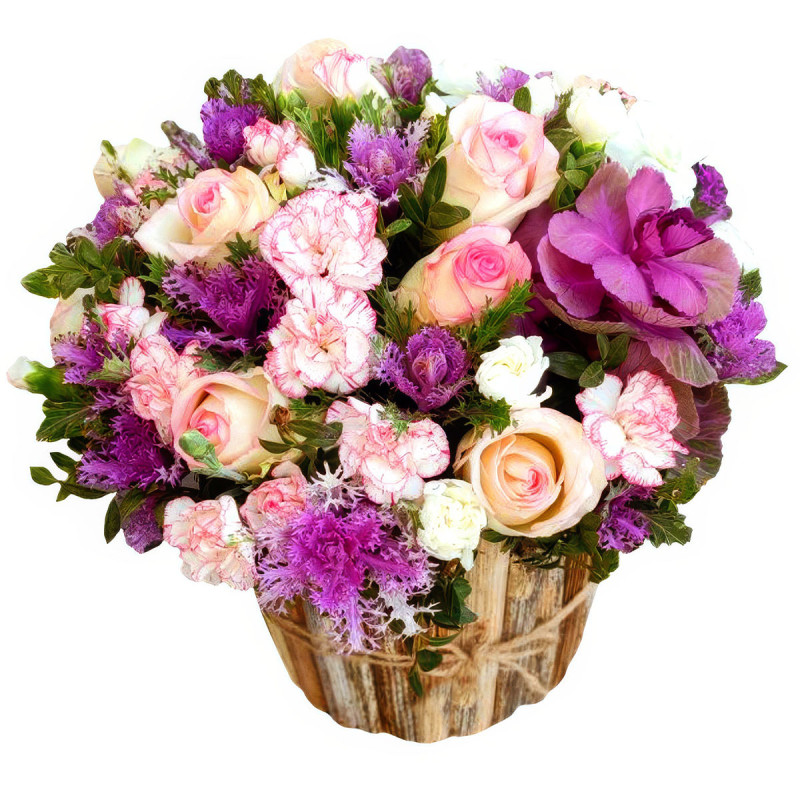 Эта композиция из розовых и фиолетовых оттенков создаёт атмосферу нежности и гармонии. В состав входят розовые одноголовые розы, декоративная капуста, розовые гвоздики и фисташка. Композиция оформлена в деревянной корзине, добавляющей природное очарование. Подходит для поздравления любимой на День Святого Валентина.