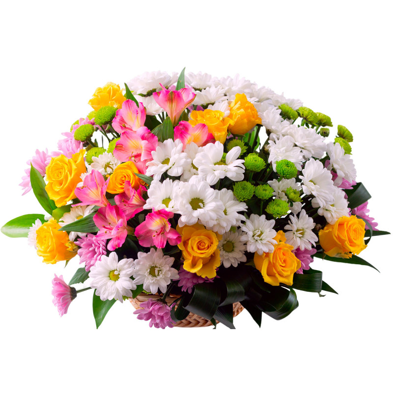 Эта яркая композиция в корзине сочетает жёлтые розы, розовые альстромерии и кустовые хризантемы белого, розового и зелёного оттенков, дополненные аспидистрой. Корзина выполнена из плетёного материала, подчёркивая натуральную красоту цветов. Она добавит радости и свежести в любой интерьер. Прекрасный подарок для учительницы на День знаний.