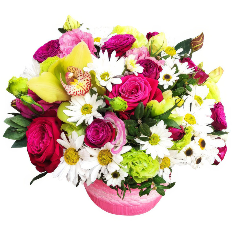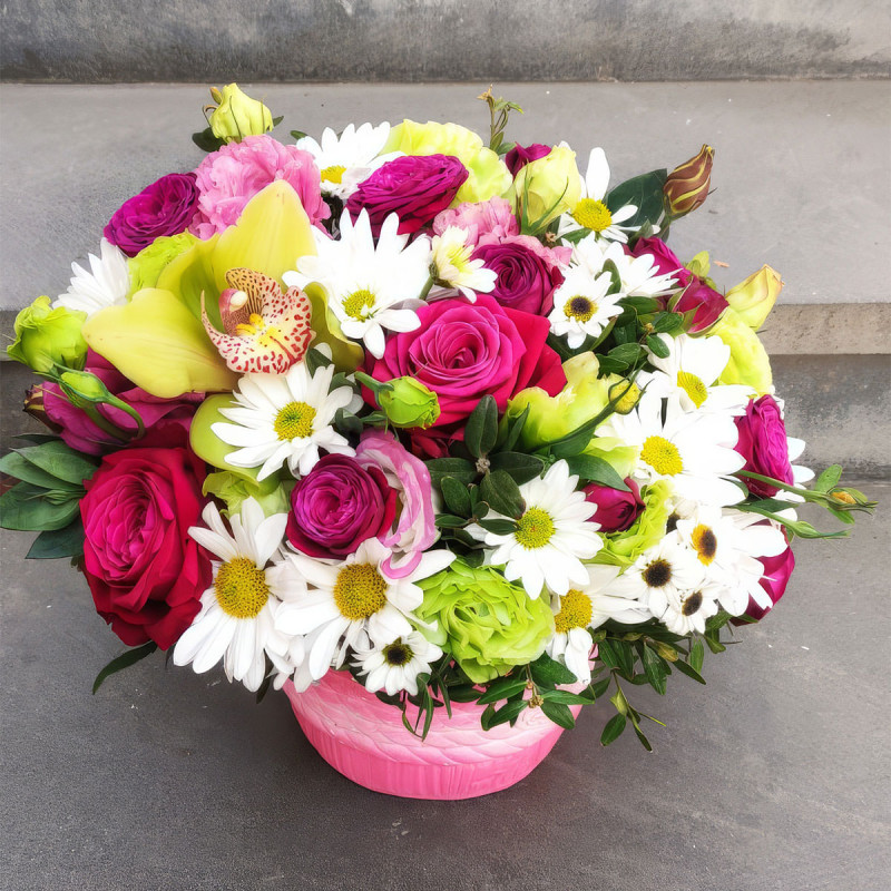 | Состав | Танацетум, Розы, Хризантемы, Орхидеи, Ромашки, Эустомы |