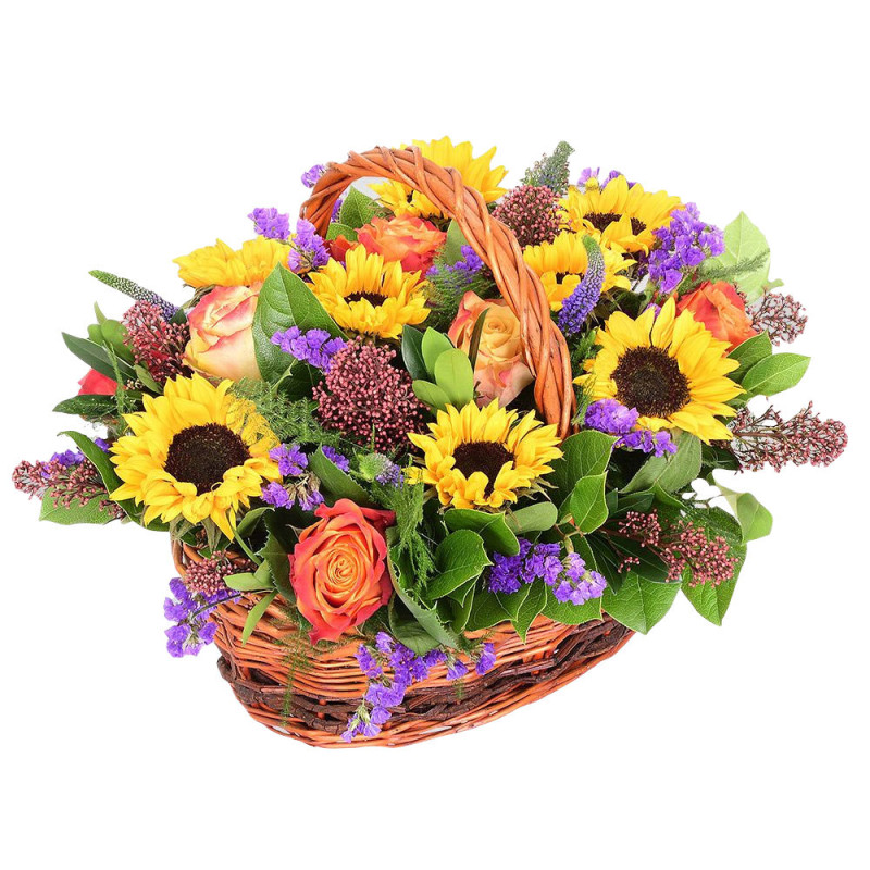 Эта яркая композиция дарит солнечное настроение благодаря жизнерадостным оранжевым розам и подсолнухам. Она гармонично дополнена вероникой, статицей и скимией, а также зеленью. Корзина из натурального плетения придаёт ей уютный и естественный вид. Создаёт атмосферу радости и тепла, идеально подходит на новоселье для любимой женщины.