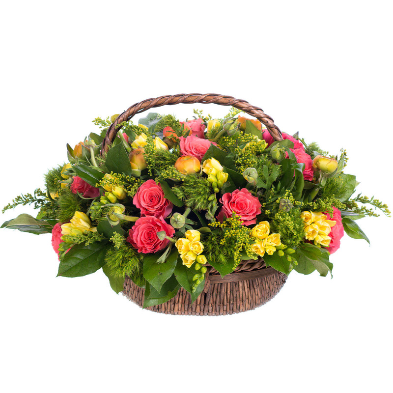 Потрясающая гамма розового, жёлтого и зелёного создаёт радостное настроение. В составе розовая одноголовая роза, жёлтая фрезия, ранункулюс и солидаго. Корзина выполнена из плетёного материала, создающего естественный и изысканный вид. Прекрасный выбор для юбилея, чтобы порадовать любимую женщину.