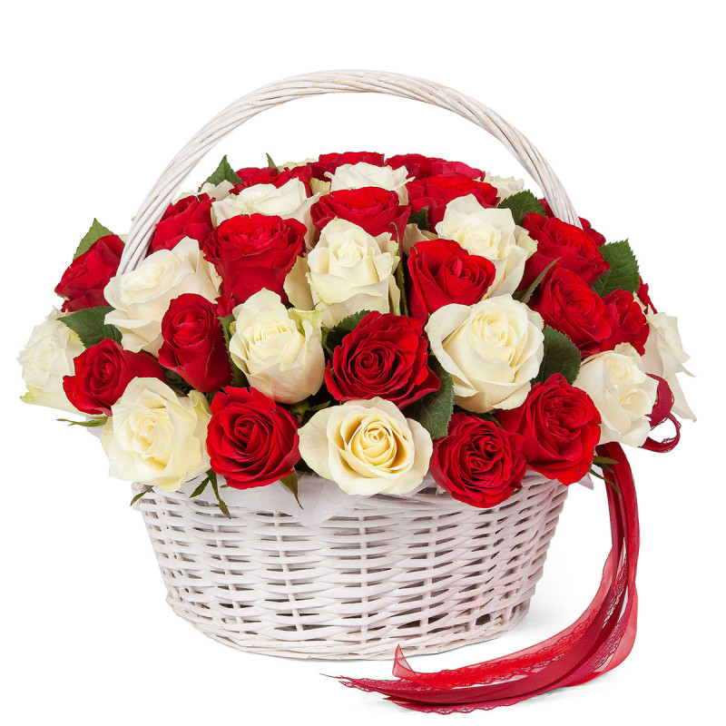 Эта композиция вызывает восхищение благодаря контрастному сочетанию красных и белых роз. В плетёной корзине представлены розы одноголовые красные и белые, что создаёт атмосферу утончённой элегантности. Подойдёт для романтического вечера для любимой женщины, даря особенные эмоции и радость.