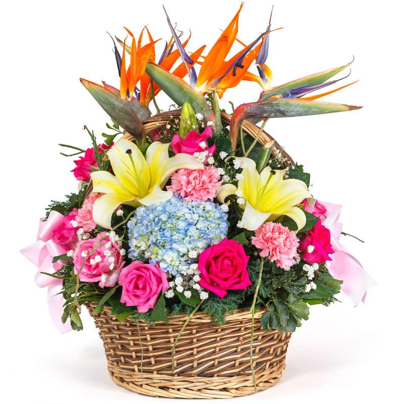 Эта яркая композиция с розовыми розами, голубой гортензией, белыми лилиями, стрелицией, розовыми гвоздиками и гипсофилой привлекает внимание своей насыщенной цветовой гаммой. Все цветы аккуратно расположены в плетёной корзине, создавая элегантный и праздничный вид. Композиция создаёт атмосферу свежести и радости, идеально подходя для декора мероприятия. Прекрасный подарок для сестры на день рождения.