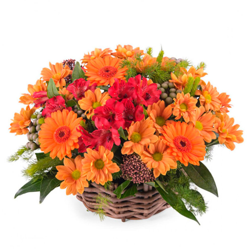 Яркая цветочная гамма оранжевых и красных оттенков привнесёт радость и тепло. В композиции присутствуют оранжевые герберы, кустовые хризантемы, красные альстромерии, бруния и аспарагус. Цветы размещены в плетёной корзине с оазисом, создавая атмосферу уюта и гармонии. Прекрасный подарок для жены на годовщину или для создания праздничного настроения.