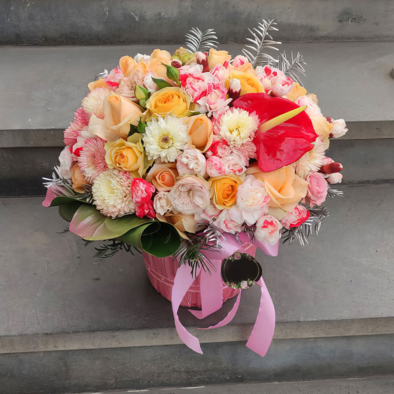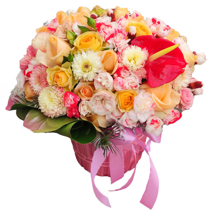Эта композиция излучает нежность и элегантность, сочетая кремовые одноголовые розы, жёлтые кустовые розы, розовые пионовидные кустовые розы, антуриум и розовые кустовые хризантемы. Корзина выполнена из плетёного материала и украшена розовой лентой. Композиция создаёт атмосферу лёгкости и радости. Прекрасный подарок для крестницы на День Святого Валентина.