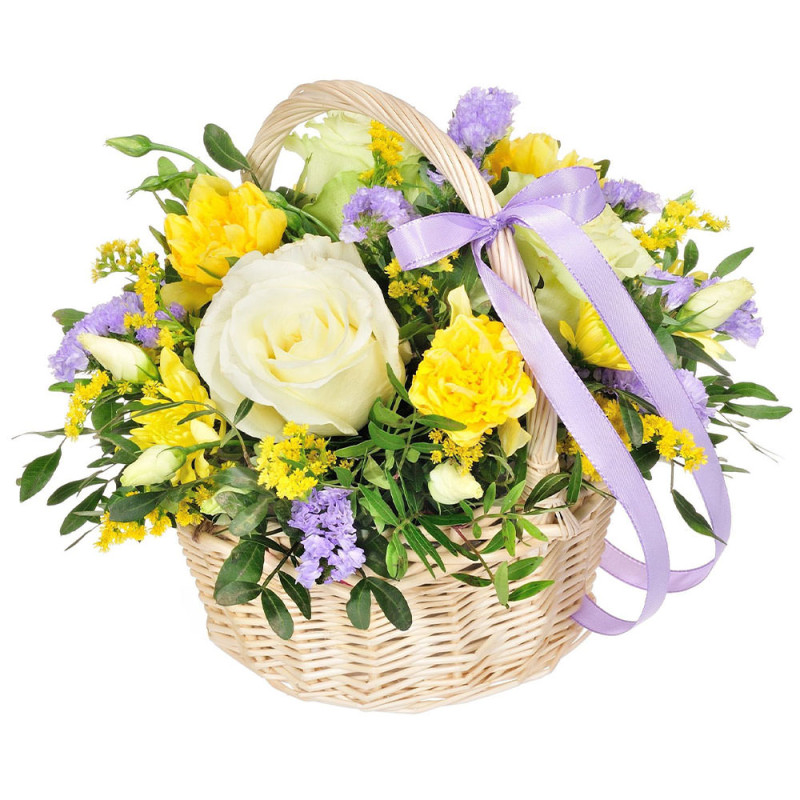 Светлое сочетание белых роз и желтых хризантем дарит ощущение свежести. В композиции также фрезия, солидага, статица и фисташка, которые наполняют корзину разнообразием. Плетёная корзина с фиолетовой лентой добавляет изысканности. Прекрасный выбор для встречи выпускников или радости для сестры.
