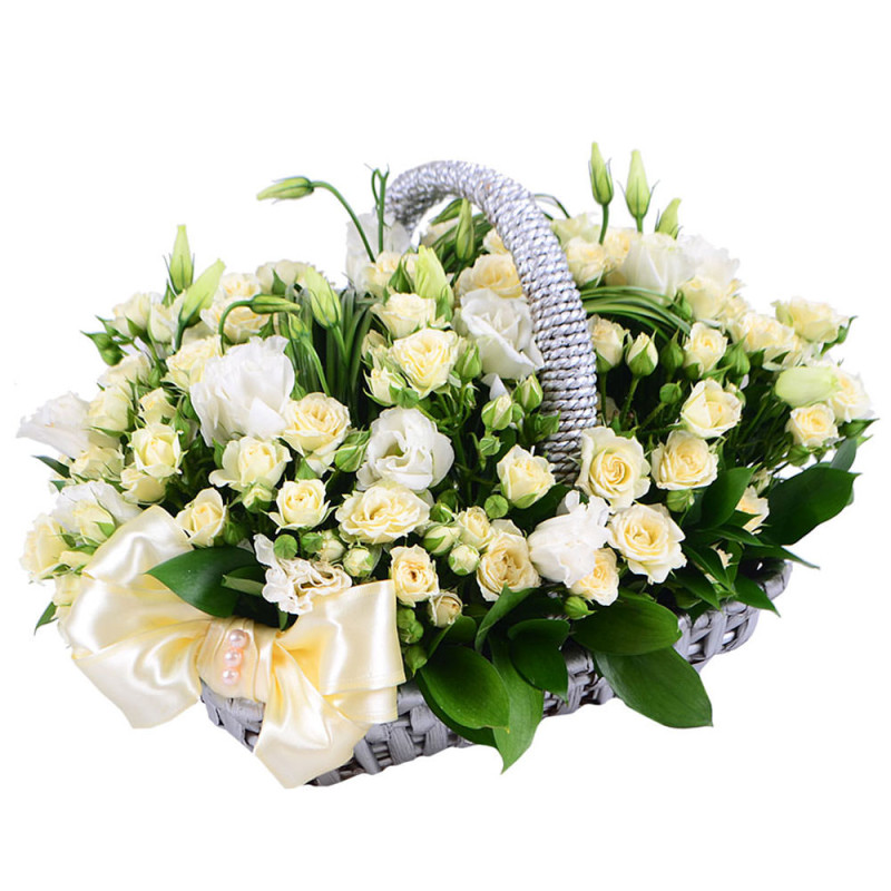 Эта светлая композиция из кремовых кустовых роз и белых эустом, дополненная зеленью, создаёт атмосферу нежности и утончённости. Цветы аккуратно уложены в плетёную корзину с изящной ручкой и украшены атласной лентой. Композиция станет прекрасным подарком для любимой женщины на годовщину.