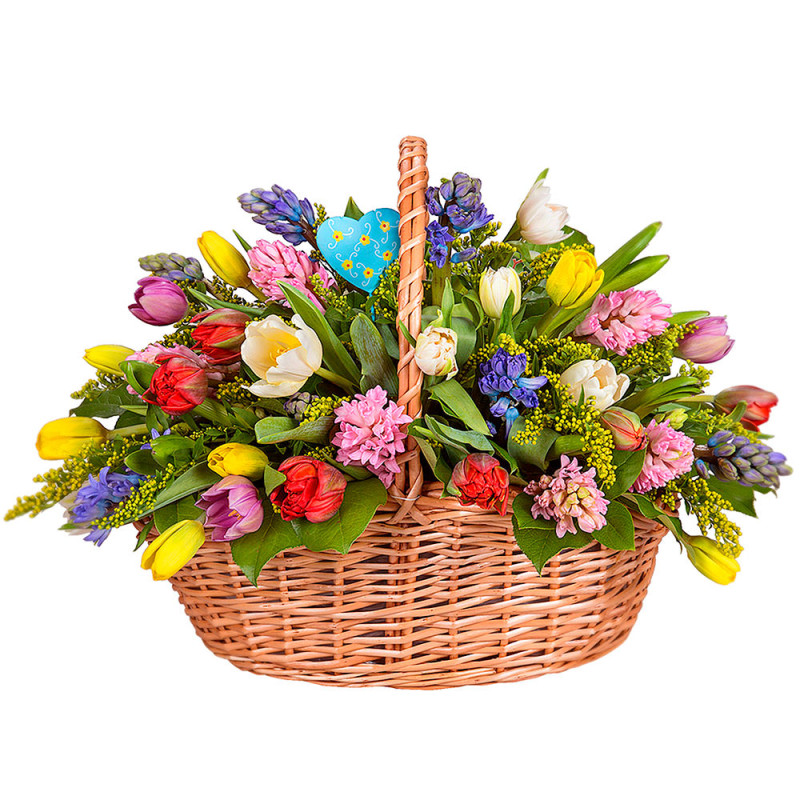 Яркая и радостная гамма цветов подарит улыбку: в композиции смешаны жёлтые, красные, сиреневые и белые тюльпаны, гиацинты и солидаго. Плетёная корзина добавляет естественности и уюта. Это создание приносит атмосферу весеннего пробуждения и свежести. Прекрасный подарок для сестры на День матери.