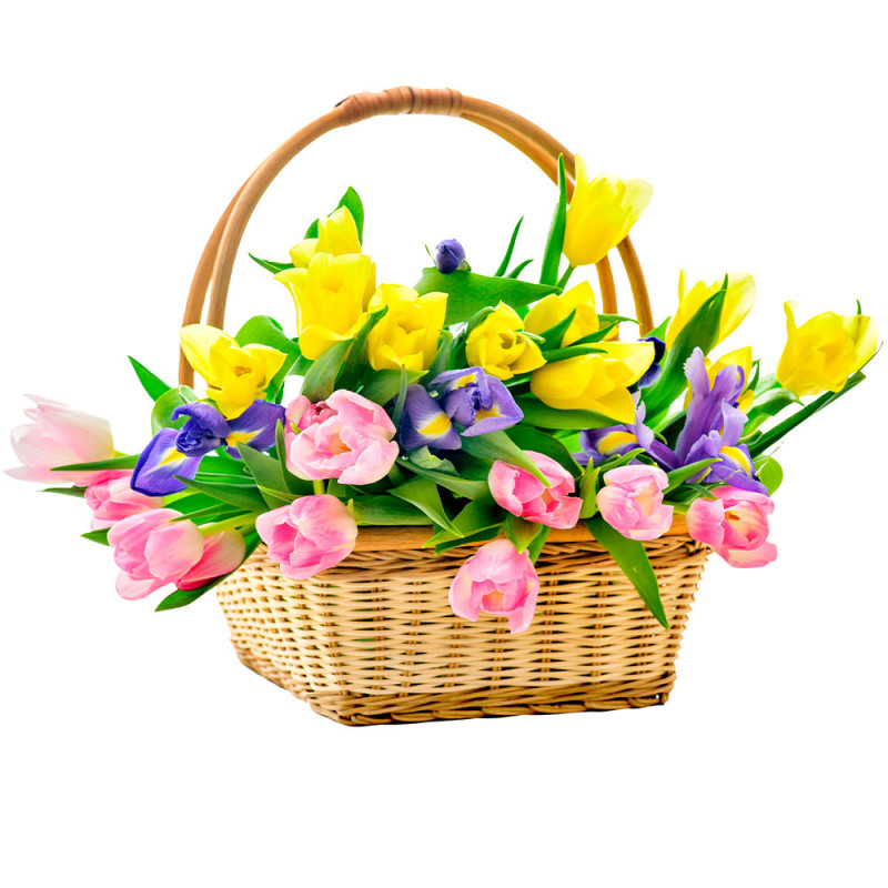 Яркая и радостная композиция из жёлтых и розовых тюльпанов с добавлением фиолетовых ирисов создаёт атмосферу весеннего настроения. Все цветы оформлены в плетёную корзину с удобной ручкой. Эта цветочная композиция станет отличным подарком на день рождения для любимой женщины.